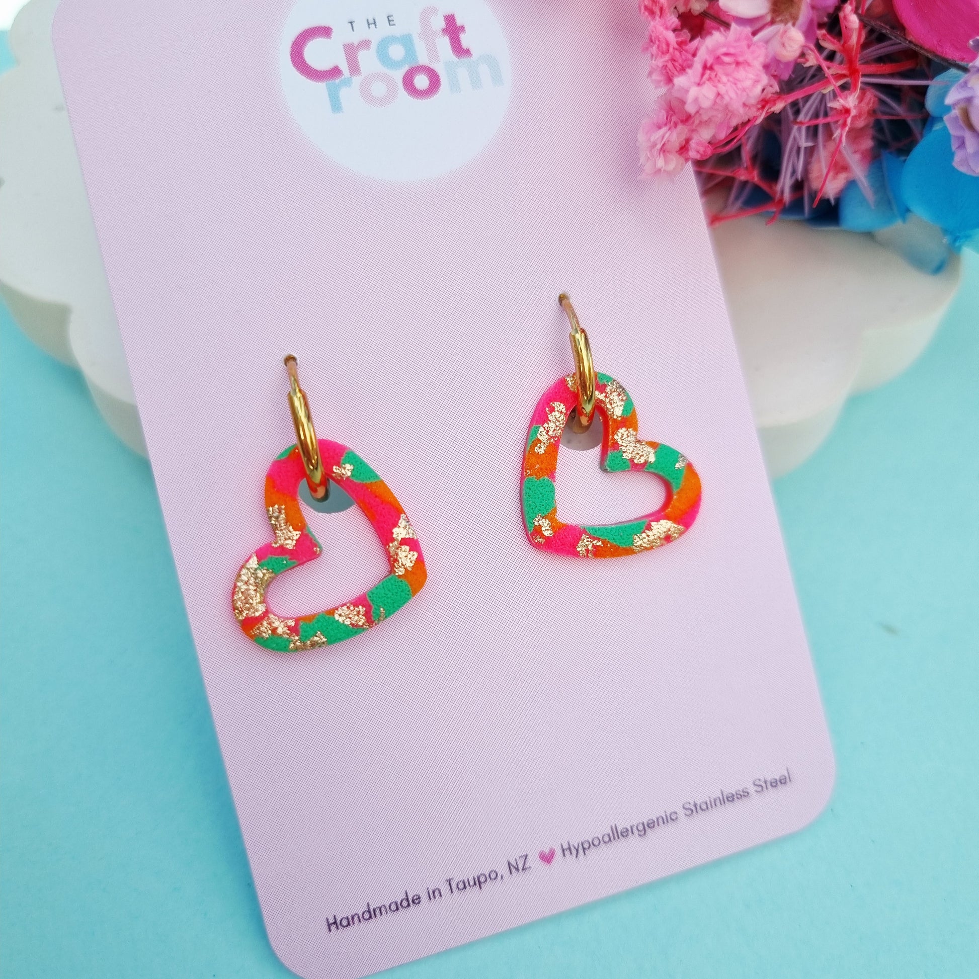 Beautiful colourful donut heart set on a gold huggie hoop.
