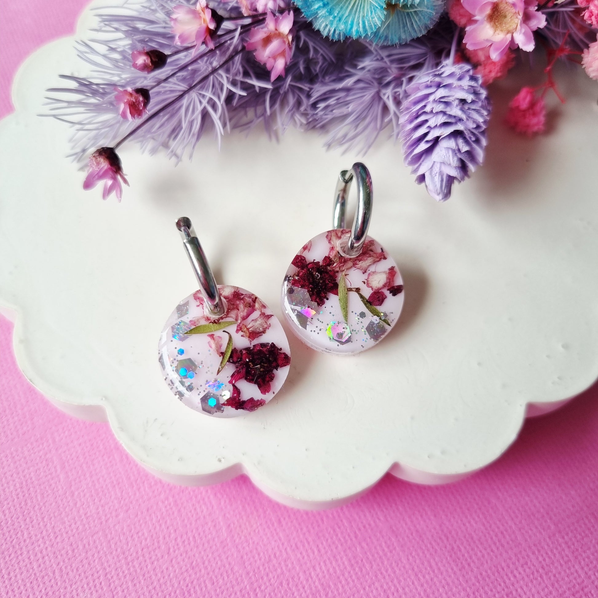 A stunning earring made with dried manuka picked right here on the farm. Immersed in resin with flecks of silver glitter and backed with a soft pink. They are just a wee bit special 🩷