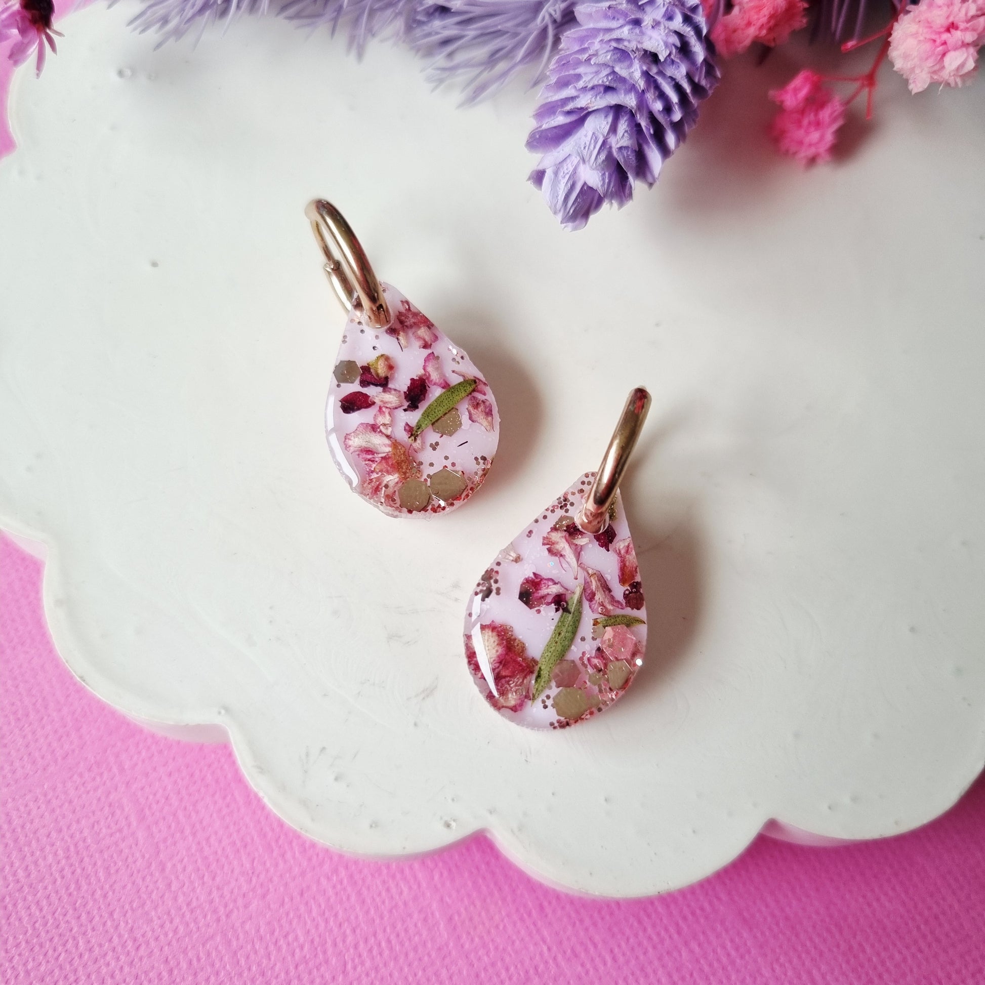 A stunning earring made with dried manuka picked right here on the farm. Immersed in resin with flecks of rose gold glitter and backed with a soft pink. They are just a wee bit special 🩷