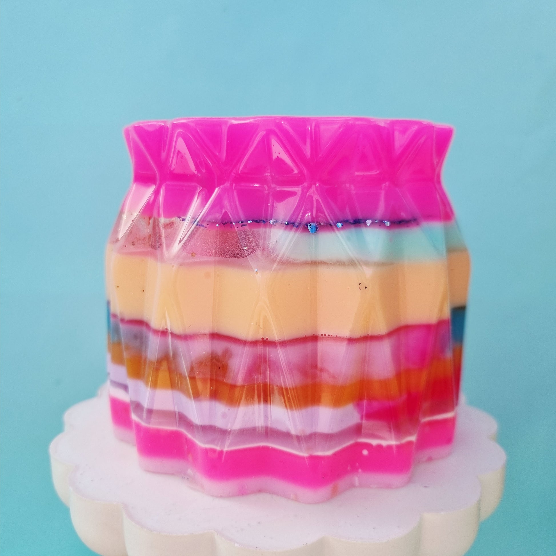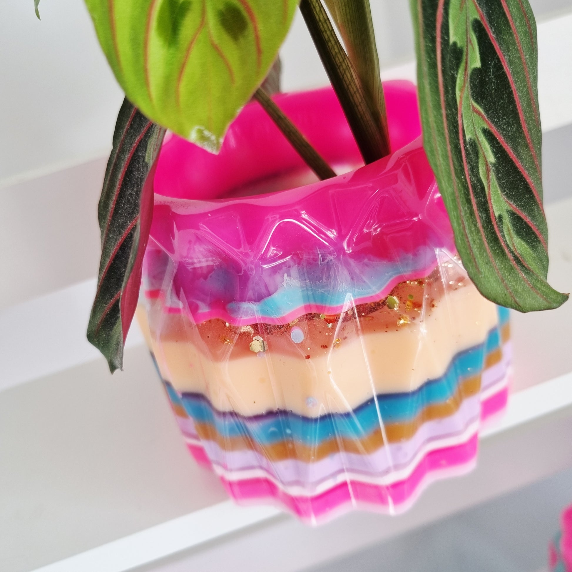 A beautiful no-waste planter with many different layers from many previous pours. These can take over a whole month to finish! She's a real one of a kind beauty!
