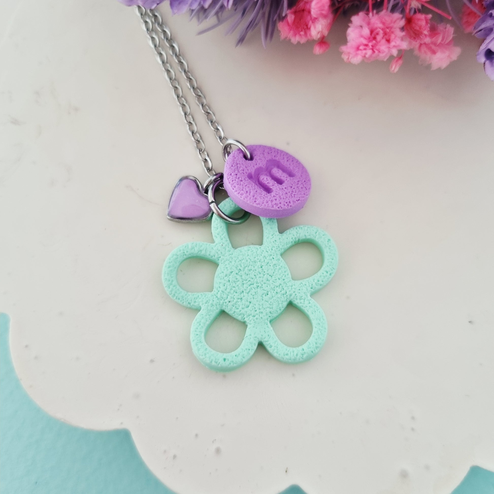 Each necklace will have the centre large flower, with a stamped initial disc and a stainless heart charm.
